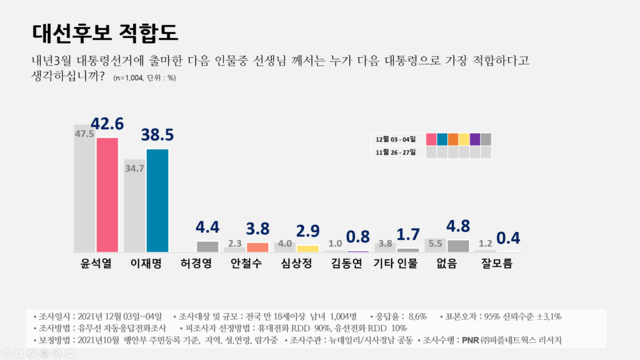 [부자동네타임즈 이교영 기자]허경영 국가혁명당 대통령 후보가 12월 5일 여론조사업체 피플네트웍스리서치(PNR)가 실시한 다자구도 대선후보 적합도 조사에서 4.4%를 기록하여 안철수, 심상정 후보를 제쳐 3위를 마크했다.