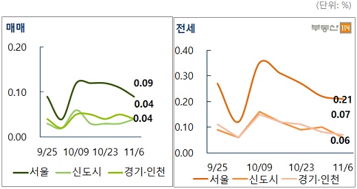 6일 부동산114에 따르면 11월 첫째 주 서울 아파트 전세가격 상승률은 지난주보다 0.01%포인트 떨어진 0.21%로 나타났다. 또 신도시는 0.06%, 경기·인천은 0.07%를 기록했다.