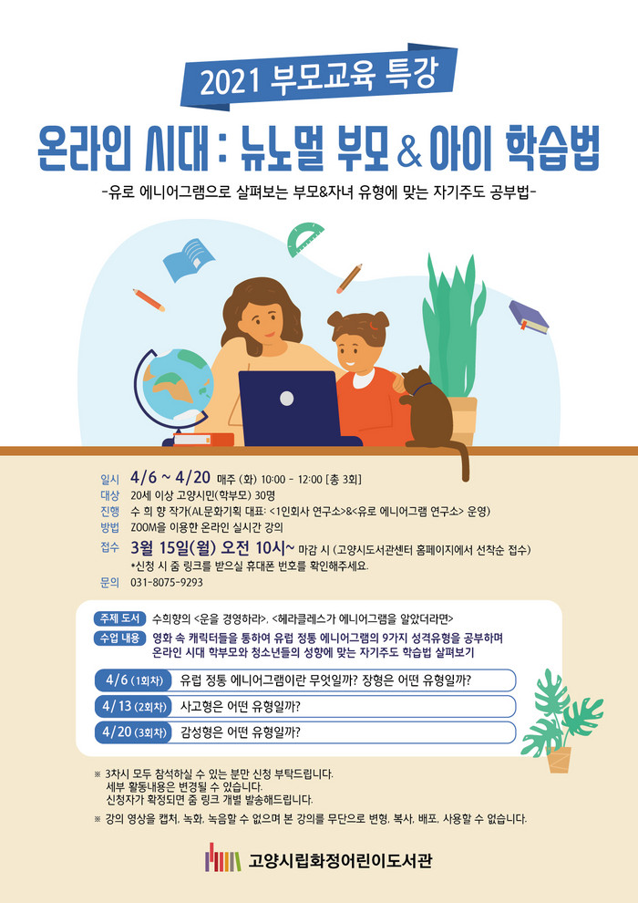 [부자동네타임즈 김인수기자] 고양시 화정어린이도서관은 코로나19로 온라인의 중요성이 부각되면서 온라인 시대의 자녀유형별 학습법을 배울 수 있는 2021 온라인 부모교육 특강 ‘온라인 시대: 뉴노멀 부모&아이 학습법’을 운영한다.