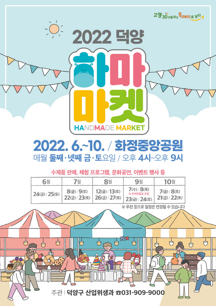 [부자동네타임즈 김인수기자] 고양시 덕양구는 오는 6월 23일부터 10월 22일까지 매월 둘째, 넷째 주 금요일과 토요일에 화정중앙공원에서 ‘2022 하마마켓’을 개최한다.