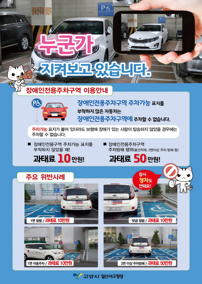 위와 같이 장애인전용주차구역 선을 일부 침범하거나 짧은 시간동안 앞 또는 옆쪽으로 이중주차를 하는 등의 경미한 행위도 과태료가 부과될 수 있다. 이에 일산서구청은 주로 발생하는 위반 행위 사례를 담은 전단지를 동행정복지센터와 신고가 빈번히 발생하는 시설의 관리자들에게 전달·홍보함으로써 장애인전용주차구역 관련 규정에 대한 시민들의 인식이 높아질 것으로 기대하고 있다.