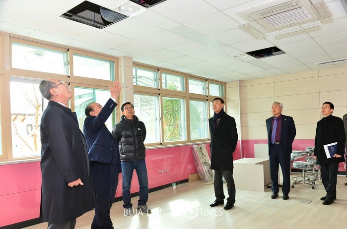 | △교육감은 동행한 시설지원단 김두환 단장과 정운용 과장으로부터 공사진행 및 시설현황 등을 보고 받고 학생과 학부모들이 불편을 겪지 않도록 남은 기간 공사와 비품구비 등 개교 준비 등 개교준비에 최선을 다해 줄 것을 당부했다 |