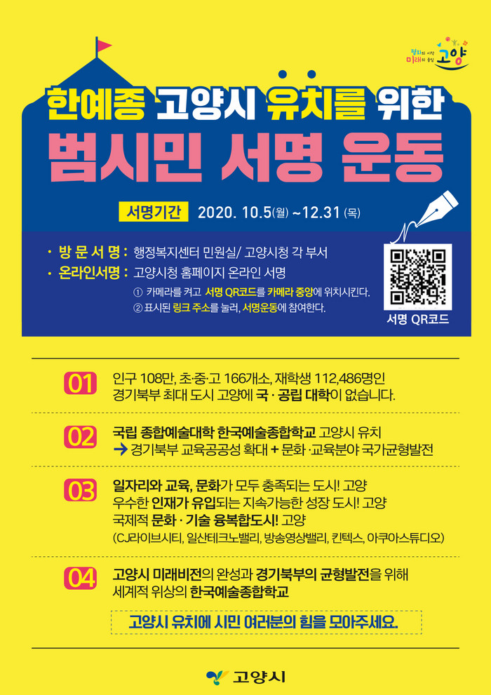 시 관계자는 “지난 10월 5일부터 진행되고 있는 ‘한국예술종합학교 고양시 유치를 위한 범시민 서명운동’에 시민 여러분의 적극적 참여를 부탁드린다”고 당부했다.