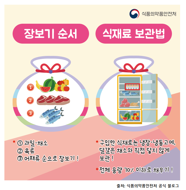 구입한 명절 음식 재료들은 바로 냉장고나 냉동고에 넣어 보관하고, 달걀은 바로 먹는 채소와 직접 닿지 않도록 보관에 주의해야 한다. 냉동보관 육류·어패류 등 장기간 보존하는 식품은 냉동고 안쪽 깊숙이 넣고 냉장실 문 쪽은 온도변화가 크므로 금방 먹을 것만 보관하는 것이 좋다.