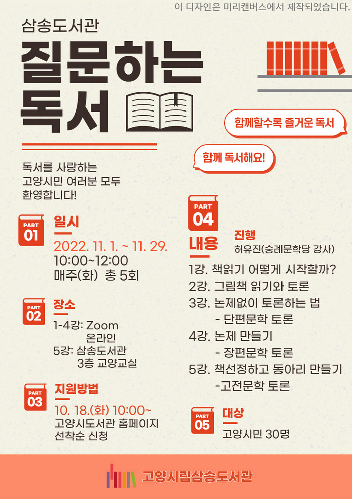 [부자동네타임즈 김인수기자] 고양특례시(시장 이동환) 삼송도서관에서 오는 11월 1일부터 11월 29일까지 매주 화요일마다 독서법 및 독서토론 프로그램 ‘질문하는 독서’를 진행한다.