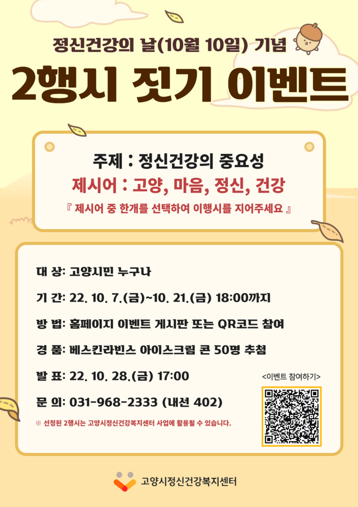 이번 이벤트는 정신건강의 날을 맞이하여 정신건강 관련 제시어 ‘고양, 마음, 정신, 건강’ 중에 하나를 선택하여 2행시를 지어 참여하면 된다.