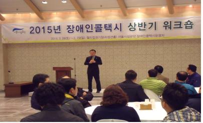 [부자동네타임즈 김정태 기자] 서울시의회 교통위원회 박기열 위원장(새정연ㆍ 동작3)은 28일 월드컵경기장(리셉션홀)에서 개최된 장애인콜택시 관계자들에 대한 ‘2015년 상반기 정기교육 및 춘계 체련대회’에 참석해 관계자들의 노고를 격려하는 한편 장애인들에 대한 인식 개선을 통해 장애인콜택시 이용편의를 증진해 줄 것을 주문했다.
