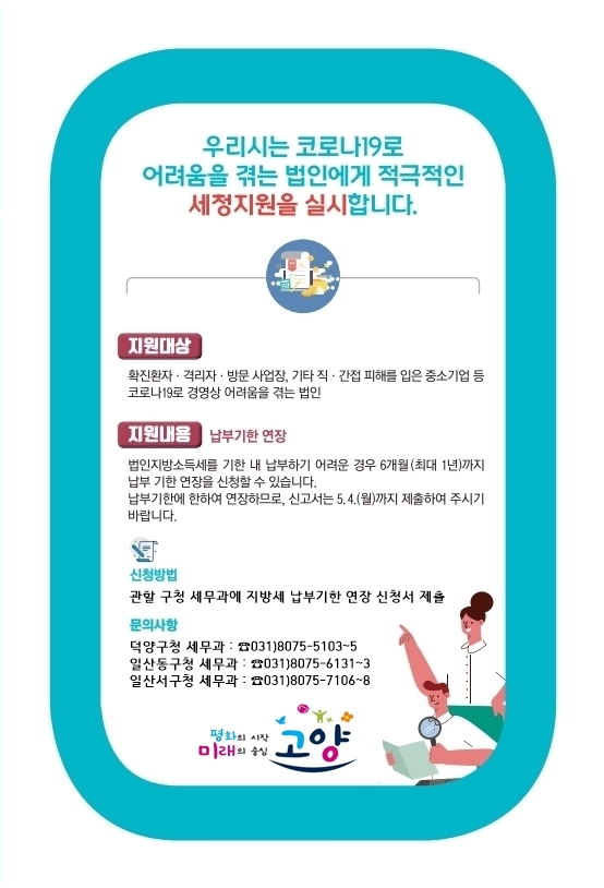 [부자동네타임즈 김인수기자] 고양시가 2019년 12월말 결산 법인에 대해 ‘2019년 귀속분 법인지방소득세’를 5월 4일까지 신고·납부해야한다고 1일 밝혔다.