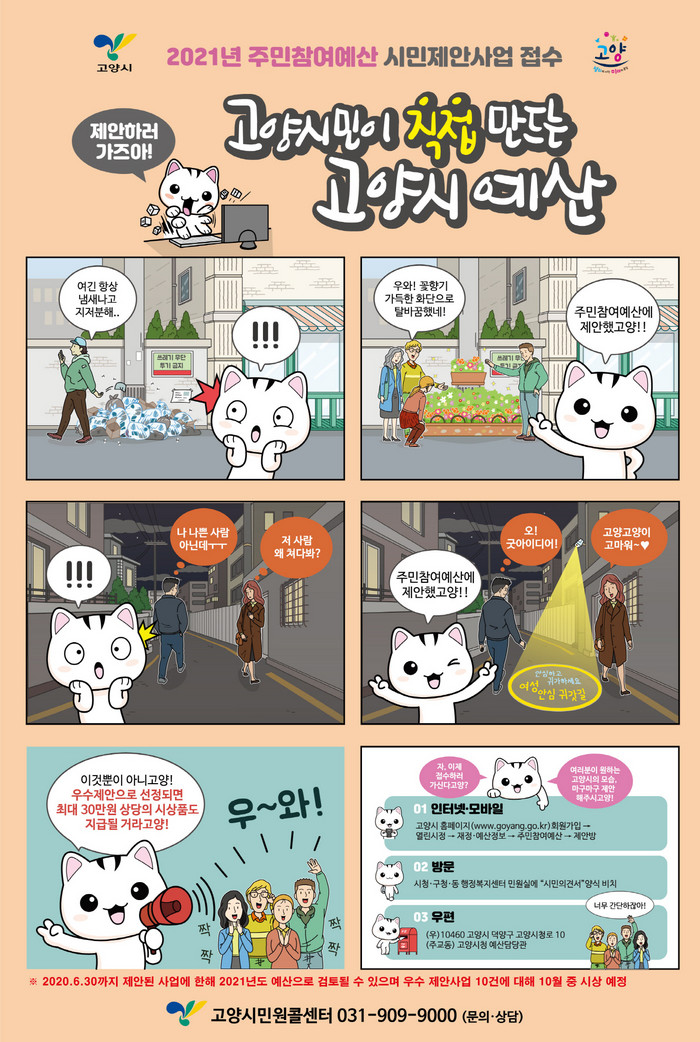 ‘고양시민이 직접 만드는 고양시 예산’이라는 슬로건을 내건 이번 공모는 고양시민으로부터 생활주변에서 느끼는 필요사업을 직접 제안 받아 실제 내년도 예산에 반영하겠다는 취지로 마련됐다.
