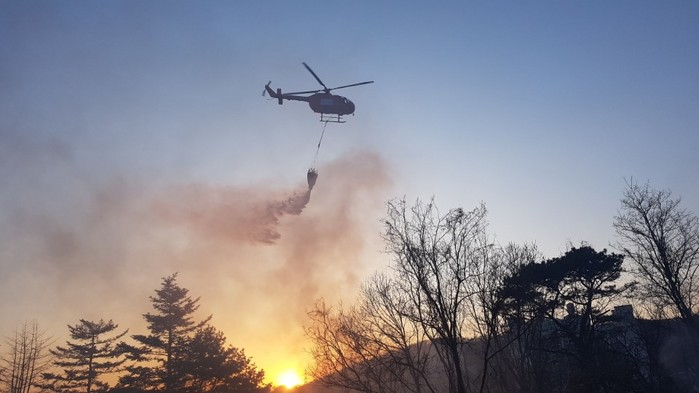 [사진설명] 소방헬기의 산불 진화 모습(2018.4.10. 대자동 일원에서 촬영)