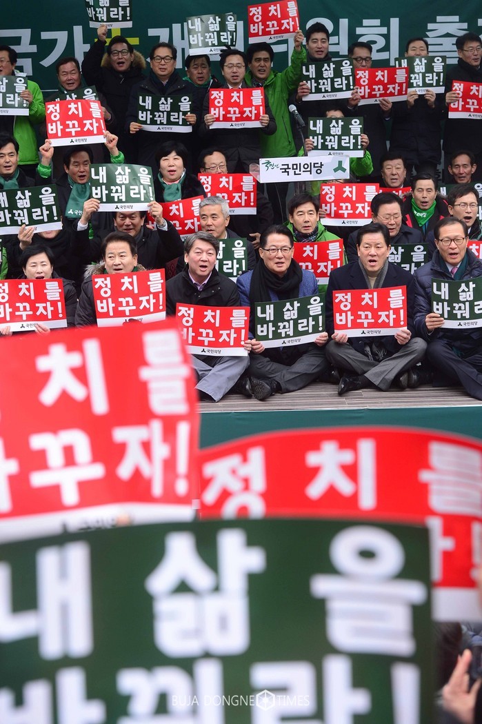 국민의당 박지원 대표와 주승용 원내대표, 안철수 전 공동대표 등 당원들이 4일 서울 종로구 세종문화회관 계단에서 열린 국가대개혁위원회 출정식에서 구호를 외치고 있다. 2017.02.04