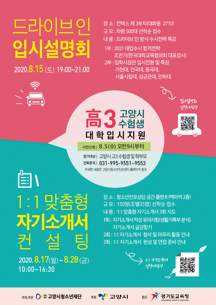 [부자동네타임즈 김인수기자] 고양시는 오는 "8월 15일부터 8월 28일까지 킨텍스 제3전시장 부지에서 고양시 청소년재단(대표이사 박윤희), 경기도 교육청과 함께 고3 수험생과 학부모를 대상으로 2021학년도 대학입시설명회 및 상담박람회를 ‘드라이브 인’ 방식으로 개최한다"고 밝혔다.