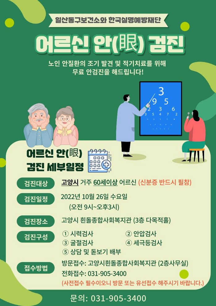 [부자동네타임즈 김인수기자] 고양특례시(시장 이동환) 일산동구보건소가 오는 10월 26일 고양시 거주 60세 이상 어르신을 대상으로 노인 안질환의 조기 발견 및 적기 치료를 위한 노인 무료 안(眼)검진을 시행한다.