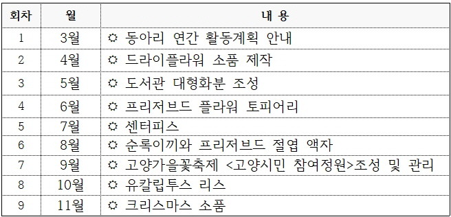 올해 꽃뜨레는 3월부터 11월까지 매월 1회 동아리 활동을 통해 다양한 꽃 관련 프로그램을 운영한다. 다양한 꽃 작품 제작 이외에도 가을에 열리는 고양가을꽃축제 고양시민 참여정원 조성과 도서관 원예 환경 조성 활동도 펼친다.