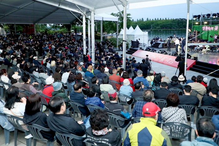 [사진설명] 일산호수공원 수변무대에서 열린 고양국제꽃박람회 개막 축하공연과 공연을 관람 중인 방문객들.
