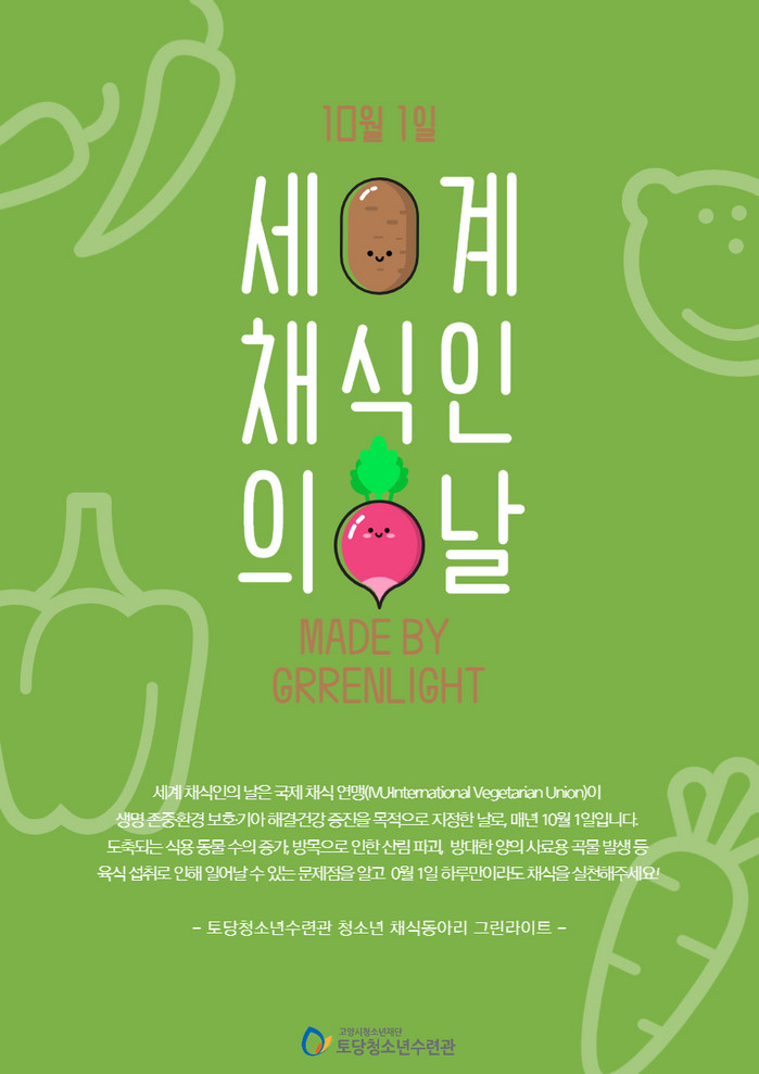 토당청소년수련관 소속 청소년 채식동아리 ‘그린라이트’가 직접 기획한 본 행사는 10월 1일 세계 채식인의 날을 맞이하여 또래 청소년이 채식의 의미와 다양한 종류, 이로운 점 등을 알아보고 관련한 문화예술 체험을 통해 채식에 대한 긍정적 인식을 가질 수 있도록 기획되었다.