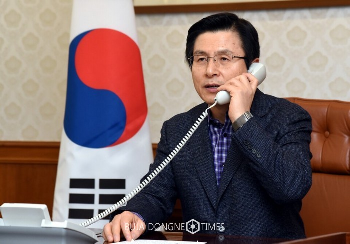 황교안 대통령 권한대행 국무총리가 설 명절 휴일 첫날인 27일 오후 정부 서울청사 집무실에서 전화로 해외 파병 중인 레바논 동명부대 대원들 및 코이카 네팔 해외봉사자들을 격려하고 있다. 2017.01.27. (사진=국무총리실 제공)