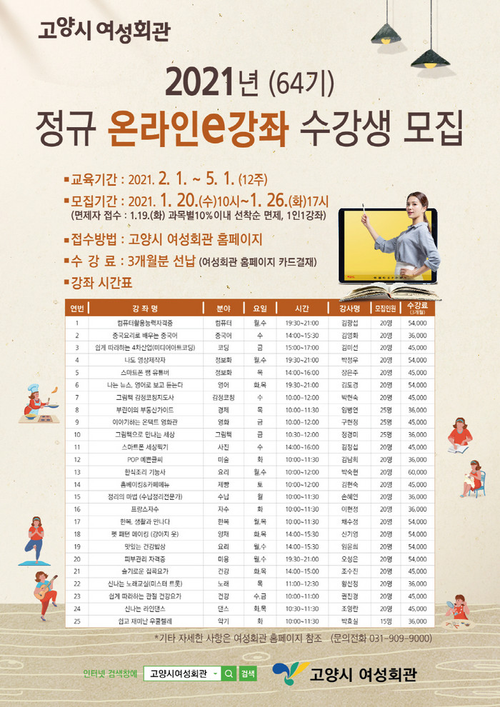 [부자동네타임즈 김인수기자] 고양시(시장 이재준) 여성회관은, 언택트 교육환경 변화에 발맞춰 비대면 온라인 교육 서비스를 강화해 2021년 정규 온라인e강좌를 별도로 개설한다. 그리고 다음달 1일 프로그램 시작에 앞서, 오는 20일부터 수강생 5백 명을 모집한다.