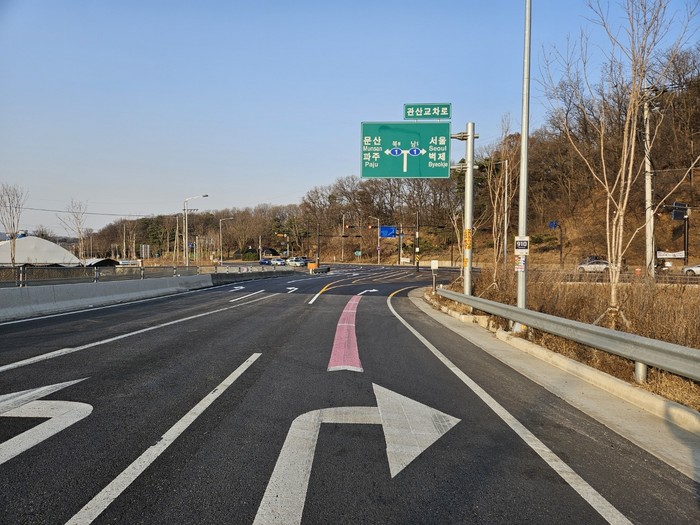 [부자동네타임즈 김인수기자] 고양특례시(시장 이동환)는 2021년 12월에 개통된 국도 39호선대체우회도로 통일로 접속구간에 좌회전 차로를 신선·연결했다. 관산교차로 이용 시 관산동 행정복지센터 쪽에서 국도39호선대체우회도로로 좌회전을 할 수 없었던 도로 불편사항이 해소 된다고 20일 밝혔다