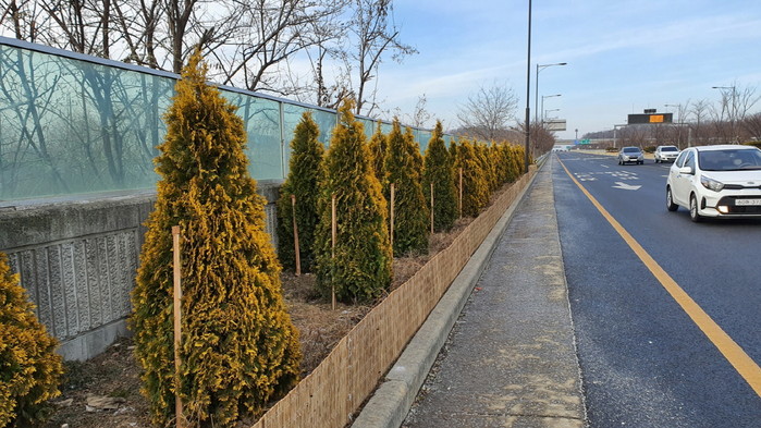 지난 11월부터 제2자유로 도로변에 미세먼지 저감 효과가 뛰어난 측백나무 등 키 큰 나무 4천주와 산철쭉 등 키 작은 나무 5만5천주를 식재해 2달간의 가로숲 조성공사를 마무리했다.