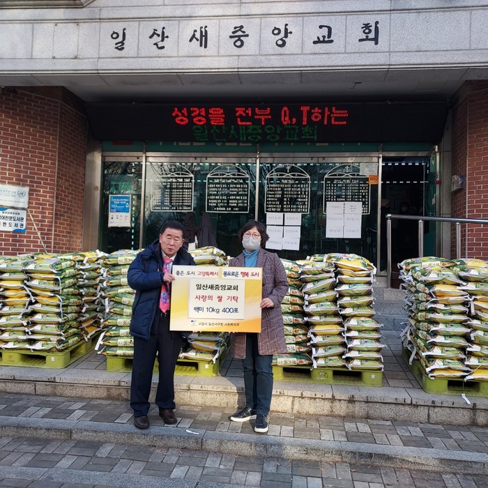 ‘일산새중앙교회’는 2020년 300포, 2021년 300포를 기탁한 바 있으며, 올해는 쌀 10kg 400포대를 흔쾌히 기탁하였다. 경제적 어려움으로 한 끼가 소중한 이웃들에게 함께하는 삶을 실천하면서 앞으로도 지속적으로 후원을 이어갈 의사를 밝혔다.