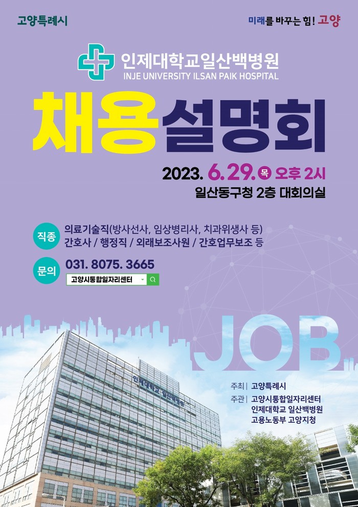 [부자동네타임즈 김인수기자] 관내 대형의료기관의 구인난 해소 및 구직자 취업 지원을 위해 ‘고양시 의료기관 일자리 릴레이 채용설명회’의 2탄을 6월 29일 일산동구청 대회의실에서 대면 및 비대면 방식으로 개최한다.