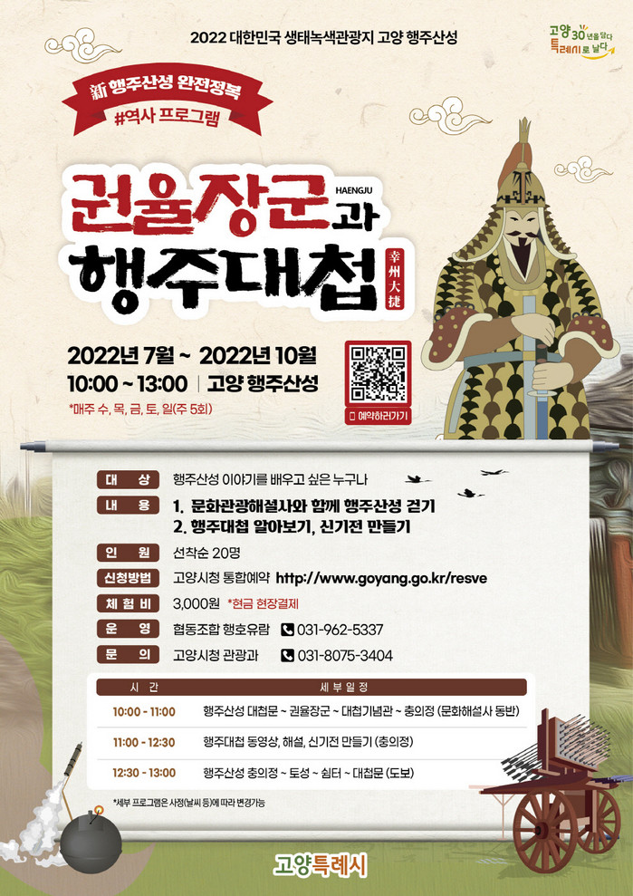 한편 고양시는 행주산성의 노후 시설을 재생하고 행주산성의 풍부한 역사와 생태 콘텐츠를 활용, 지속가능하고 매력적인 관광명소를 만들기 위해 ▲역사·생태 체험프로그램 ▲스토리기반 포토존 ▲시민참여형 공공 프로젝트 등을 선보일 예정이다.