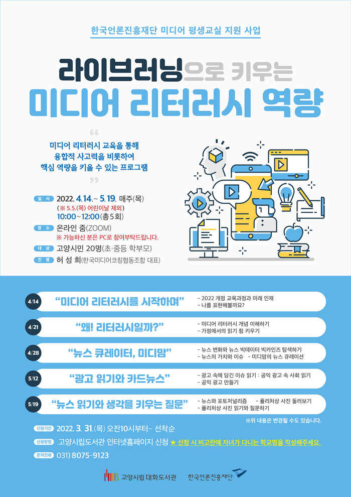 [부자동네타임즈 김인수기자] 고양시 대화도서관이 4월부터 뉴스 리터러시·미디어 리터러시 향상을 위한 2022년 ‘미디어교육 평생교실’ 프로그램을 운영한다.