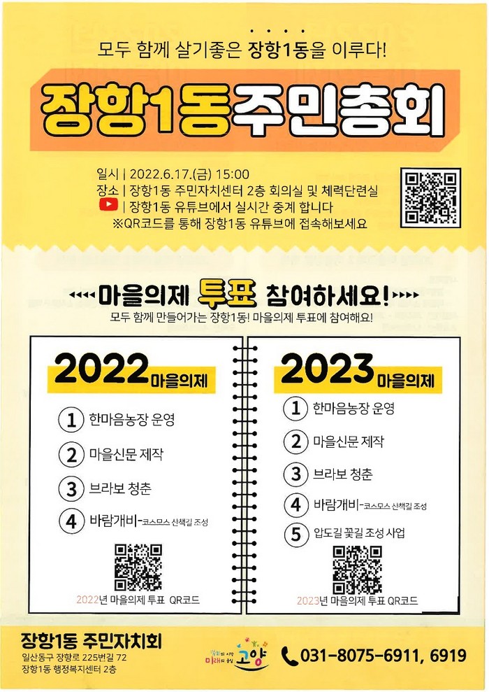 온라인 투표는 마을 곳곳에 배포된 홍보전단지의 QR코드 스캔을 통해 6월 15일까지 투표가능하며, 대상은 장항1동 주민등록 거주자, 장항1동 소재 사업장, 학교, 기관 단체에 속해 있는 만18세 이상의 주민이다.
