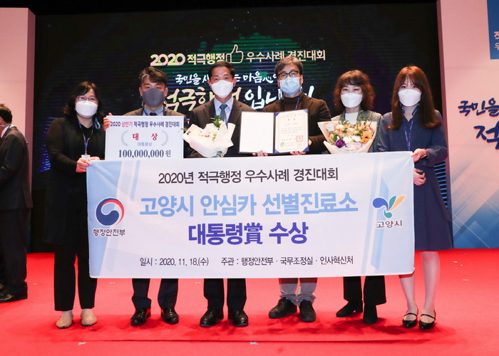이번 경진대회는 전국 지자체의 적극행정 우수사례를 공모 받아 1·2차 서면심사를 거쳐 상위 4개 사례를 선정하고, 본선 발표심사에서 전문가와 온라인 국민투표단의 심사를 통해 최종순위를 결정하는 방식으로 진행됐다. 고양시 ‘안심카 선별진료소’가 대통령상을 받았다. 대상을 수상한 고양시에는 특별교부세 1억 원이 수여된다.