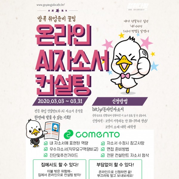 ‘온라인 AI자기소개서 컨설팅’은 청취다방 홈페이지(http://www.goyangjobcafe.kr)를 통해 신청할 수 있다.