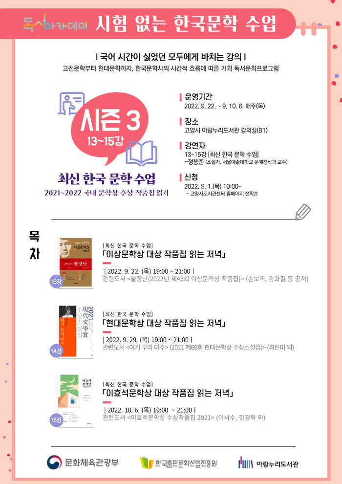 [부자동네타임즈 김인수기자] 고양특례시(이동환 시장) 아람누리도서관이 9월 22일부터 10월 6일까지 시험 없는 한국문학 수업의 시즌3을 진행한다.