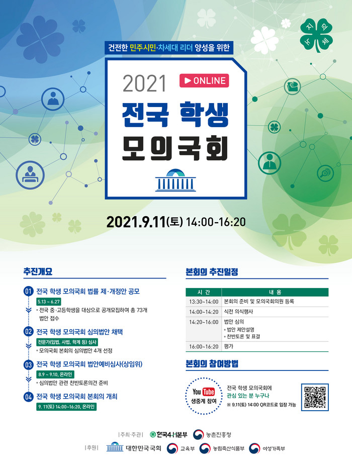이번 모의국회 의장은 김서진 학생(전남 고흥산업과학고·전국학생4-H연합회 회장)이 맡고, 전국학생4-H연합회 중앙위원들이 모의국회의원으로서 온라인 회의에 참여한다.