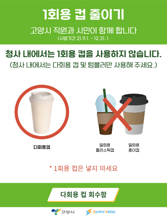 [부자동네타임즈 김인수기자] 고양시가 일회용 컵 없는 공공청사 만들기에 나섰다. 시는 11월 1일부터 12월말까지 시청에 근무하는 전 직원 및 청사를 방문하는 시민을 대상으로 일회용품 사용 근절을 위한 ‘다회용 컵 테이크아웃’ 시범사업을 추진한다고 밝혔다.