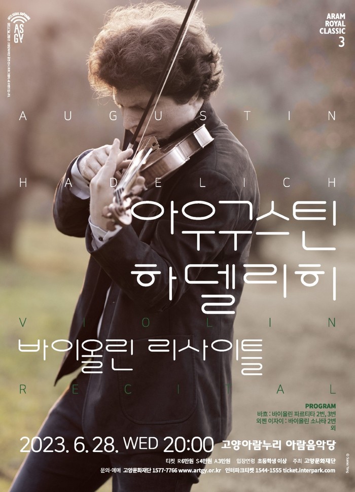 [부자동네타임즈 김인수기자] 고양문화재단은 2023 아람 로열 클래식 시리즈 세 번째 공연으로 오는 2023년 6월 28일(수) 고양아람누리 아람음악당에서 아우구스틴 하델리히 바이올린 리사이틀을 개최한다고 밝혔다. 이번 공연은 2017년 서울시립교향악단 협연으로 국내 관객들을 만나온 그가 국내에서 처음 선보이는 솔로 무대이다.
