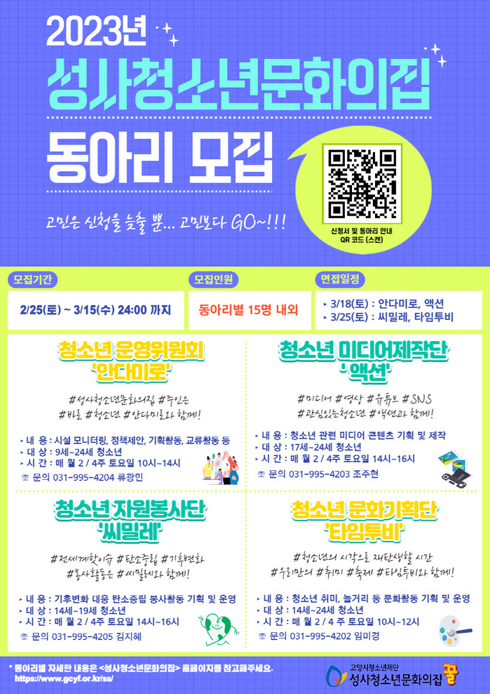 신청 기간은 2월 25일(토)부터 3월 15일(수)까지 온라인 서류 접수 후 1차 서류심사, 2차 면접 심사를 거쳐 선발할 예정이다. 신청서는 성사청소년문화의집 홈페이지 공지사항 링크를 통해 작성할 수 있다.