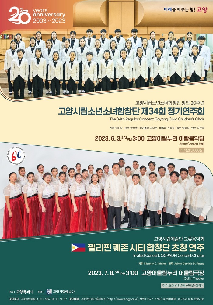 [부자동네타임즈 김인수기자] 여름이 성큼 다가오는 6월, 2003년 창단 이래 고양특례시를 대표하는 청소년 시립예술단체로 시민들에게 많은 기쁨을 선사해 온 고양시립소년소녀합창단이 창단 20주년을 맞이했다. 이를 기념해 고양시립소년소녀합창단이 제34회 정기연주회를 오는 6월 3일(토) 오후 3시 고양아람누리 아람음악당에서 개최한다.
