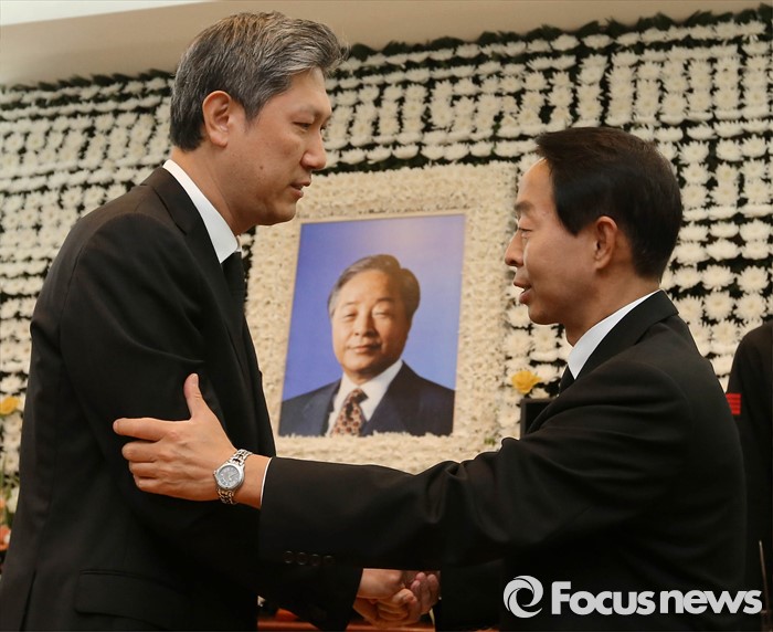 재헌씨는 영정에 헌화한 뒤 고인의 명복을 빌고 현철씨와 손을 맞잡았다.