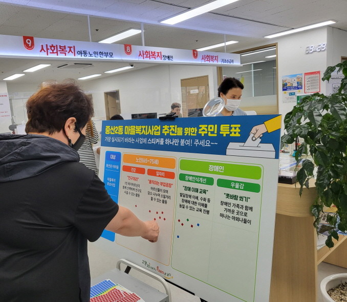 행정복지센터를 내방하는 민원인을 대상으로 투표를 진행하며 보드판 스티커 부착 방식을 통해 분야별 가장 많은 스티커가 부착된 사업을 선정하여 2022년 하반기 중산2동 복지사업으로 추진할 예정이다.