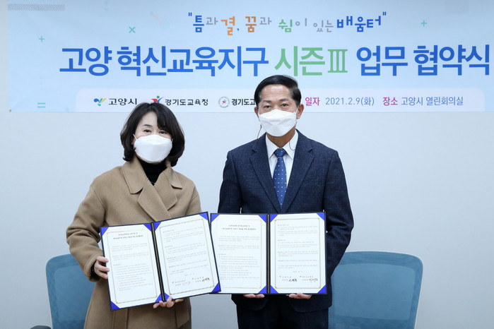 시는 지난 9일 시청 열린회의실에서 이재준 고양시장과 최승천 고양교육장이 참석한 가운데, 경기도교육청과 혁신교육지구 시즌Ⅲ 업무협약을 맺고 고양교육지원청과는 2021년 세부사업 운영을 위한 부속합의를 체결했다.