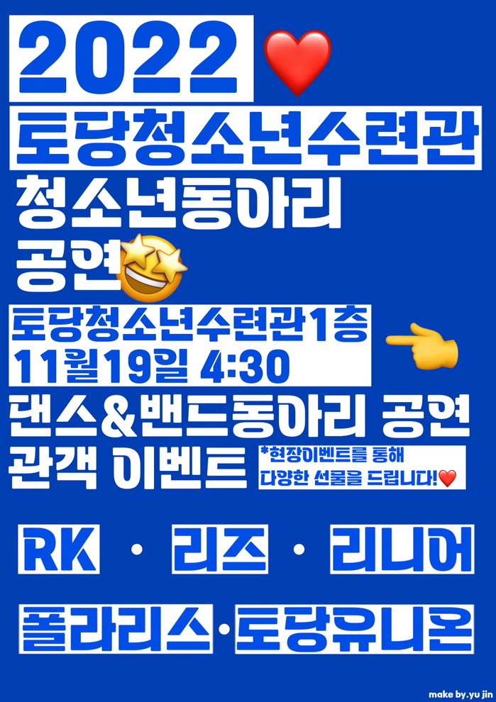 [부자동네타임즈 김인수기자] (재)고양시청소년재단(대표이사 박윤희) 토당청소년수련관은 오는 11월 19일(토) 오후 4시 30분부터 토당청소년수련관 1층 공연장에서 2022년 청소년 자율동아리 연합활동을 운영한다고 밝혔다. 이번 연합활동은 청소년 동아리가 주도적으로 참여하여, 청소년의 끼를 마음껏 펼치고 지역 청소년과 주민이 함께 즐길 수 있는 공연 형태로 운영된다.