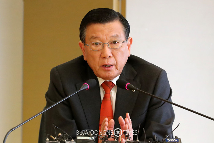 박삼구 금호아시아나그룹 회장이 28일 서울 종로구 금호아시아나그룹 본사에서 기자간담회 열고 금호홀딩스와 금호고속 합병 완료에 따른 그룹 현안 등을 발표하고 있다. 2017.11.28.