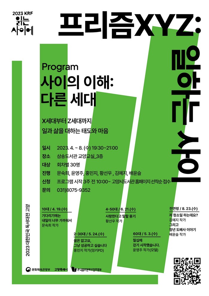 고양시는 제10회 2023 대한민국 독서대전을 유치하여 기획 프로그램 ‘프리즘 XYZ: 일하는 사이’를 운영한다. ‘일’이라는 주제를 각기 다른 세대의 시선으로 바라보는 프로그램이다.