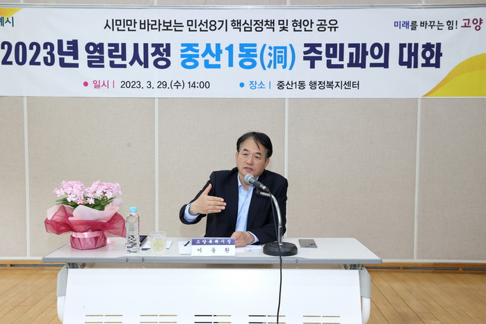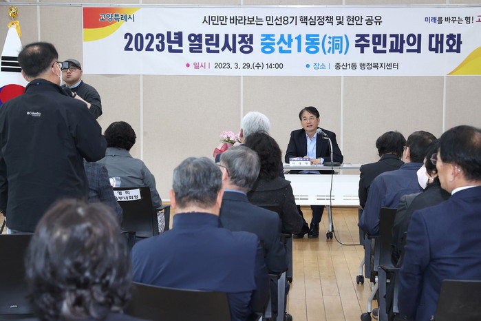 [사진설명] 중산1동 주민들과 이동환 고양특례시장이 주민과의 대화를 진행하고 있다.