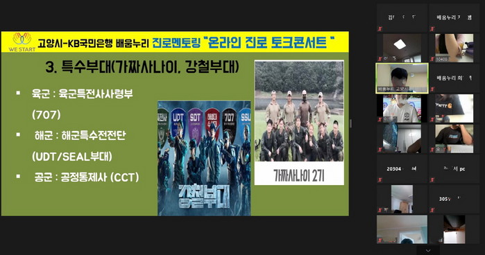 [부자동네타임즈 김인수기자] 고양시 KB국민은행 배움누리가 지난 4일 관내 저소득가정 청소년 22명을 대상으로 진로 탐색과 동기부여를 위해 전문 분야 직업군을 초빙해 온라인 진로 멘토링을 진행했다.