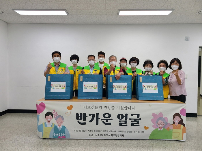 삼송1동 지역사회보장협의체는 특화사업으로 홀몸어르신가구의 고독사를 방지하고, 사회적 돌봄을 강화하기 위해 매분기 지역사회보장협의체 위원과 행정복지센터 직원이 함께 조별로 나누어 어르신 안부 확인차 가정방문하며 식품 및 생활용품을 전달하는 ‘반가운 얼굴사업’ 을 추진하고 있다. 지난 1분기에는 상비약품을 담은 구급약상자, 2분기에는 복맞이 삼계탕을 전달했다.
