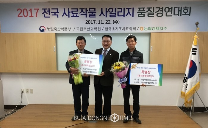[부자동네타임즈 손권일 기자]전남 영암군은 지난 22일 농림축삭식품부 주최로 경기 안성시 팜랜드에서 열린 『2017년 전국 사료작물 사일리지 품질경연대회』에서 영암군 약수영농조합법인 전용선 씨가 출품한 사일리지가 전남에서 유일하게 특별상인 국립축산과학원장상을 수상했다고 밝혔다.