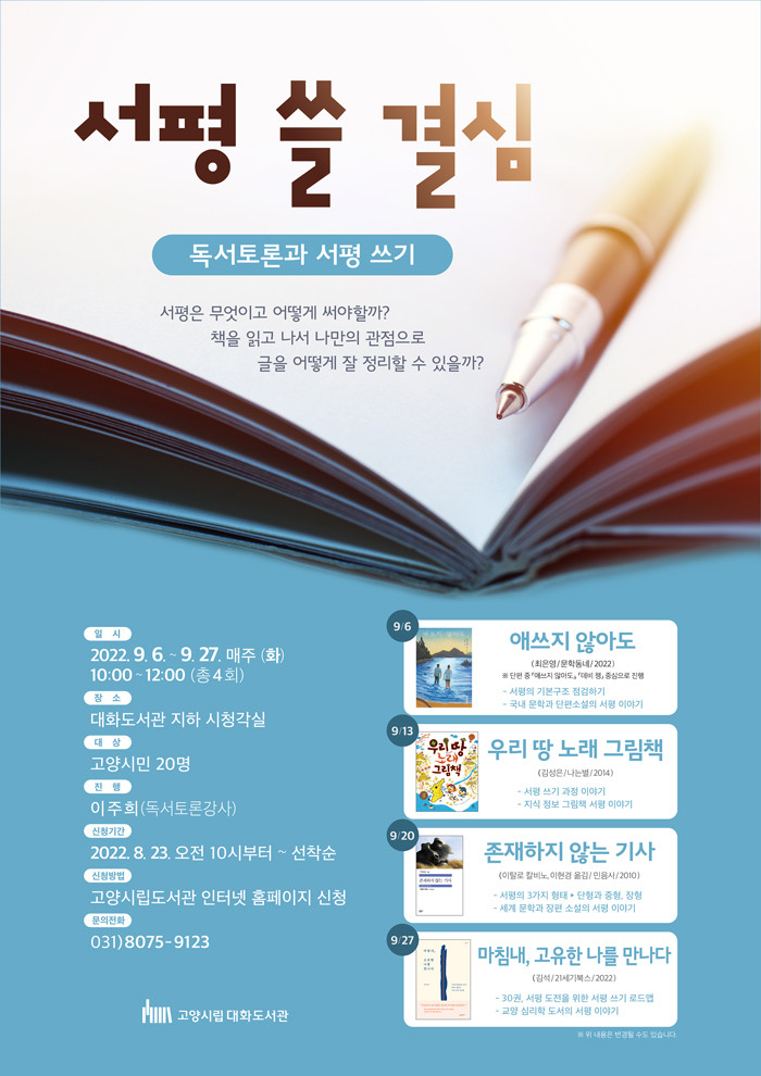 [부자동네타임즈 김인수기자] 고양특례시(시장 이동환) 대화도서관이 글쓰기 프로그램 서평 쓸 결심을 9월 6일부터 9월 27일까지 운영한다.