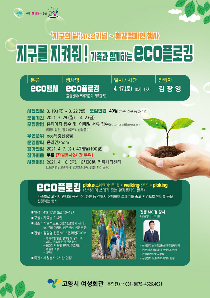 ‘지구의 날(4/22)’기념으로 기획된 이번 캠페인은 고양시민 100명이 함께하며, 40개 팀별 참여 동기 인터뷰, 퀴즈, 산책 장소 소개 등 고양시의 아름다운 생태환경에 대해 언택트 방식으로 소통하는 새로운 방식의 행사다. 진행자는 KMA한국능률협회 교수이며 삼성전자 신제품 전문프리젠터인 (주)인사이트로드 대표 김광영 MC‧강사다.