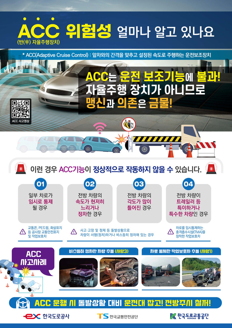 김호승 경찰청 생활안전교통국장은 “ACC는 운전 보조기능으로 이용 중 돌발상황이 발생하면 경고음 등으로 운전자에게 위험상황을 알려주고 있으나, 운전자 개입이 없으면 경고 없이 해제되는 경우도 있다”며, “운전 중 ACC 기능에 지나치게 의존해서는 안된다”고 말했다.